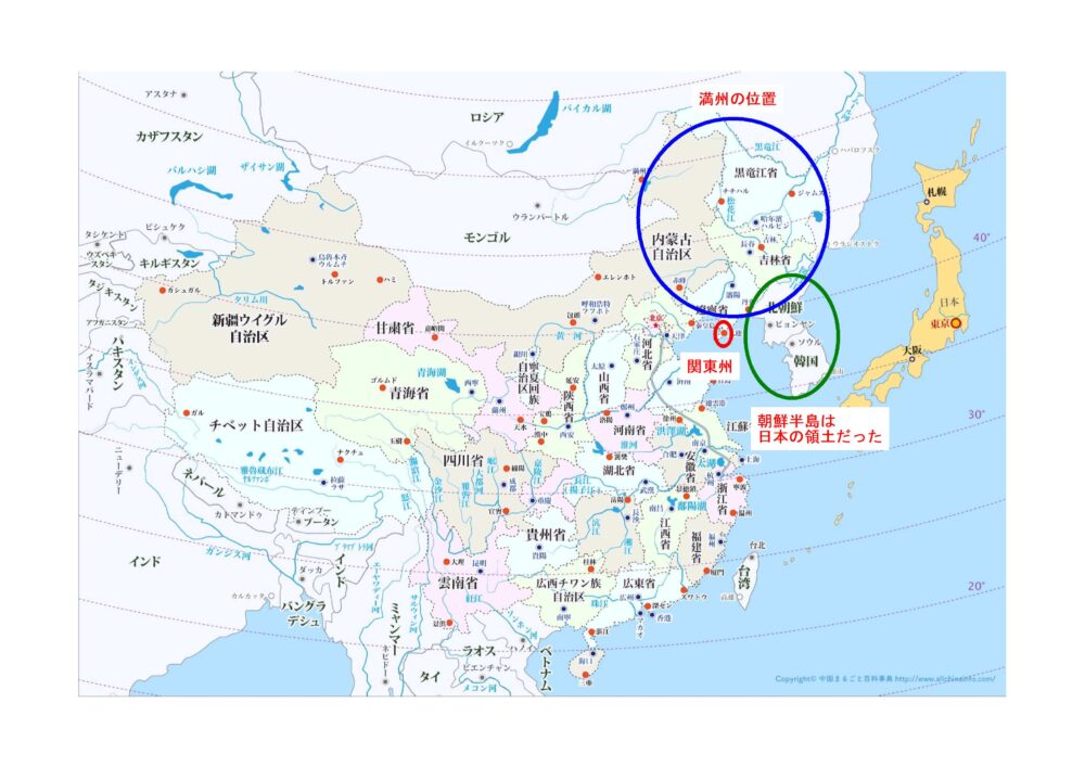 満州とは現在の中国北東部である。正確にここと説明するのは難しい。満州、満蒙(満州と蒙古)と言われたりして言葉の表現も曖昧である。この記事でも、満州=満蒙と思ってもらいたい。万里の長城より北側の地域である。後に満州国という言葉も出てくるが、満州に作った国と思ってもらえればよい。