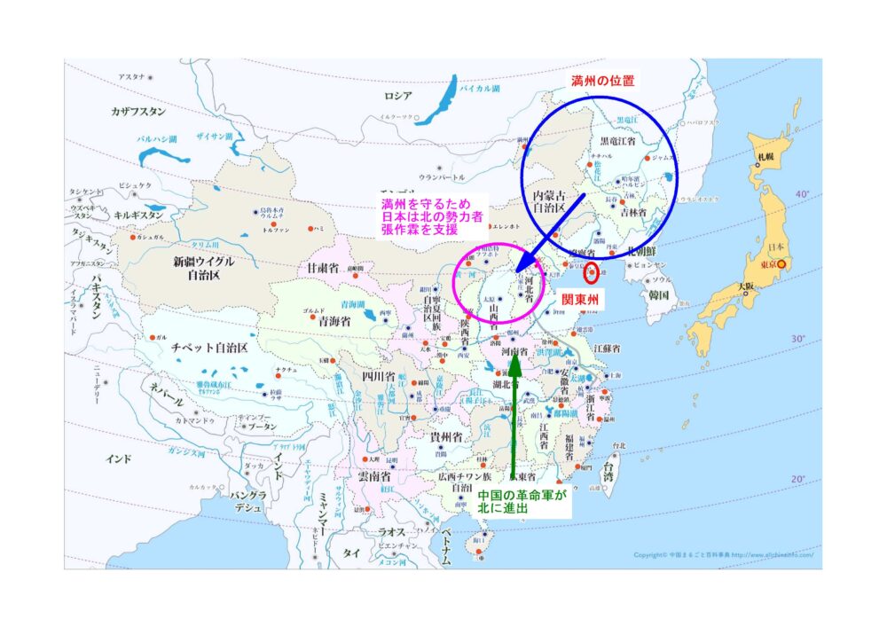 一方、日本は日露戦争後、北方の満蒙を実効支配していた。そこに南から国民革命軍が北伐して来ることに対して、自分たちの権益が損なわれるのではないかと危機感を感じていた。そこで北京を実質支配している張作霖を支援し満蒙における日本の権益を守りたいという思惑があった。